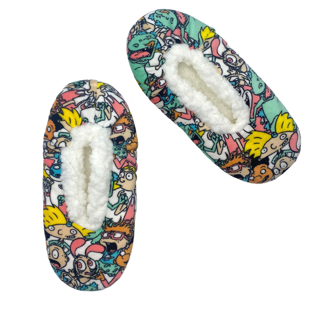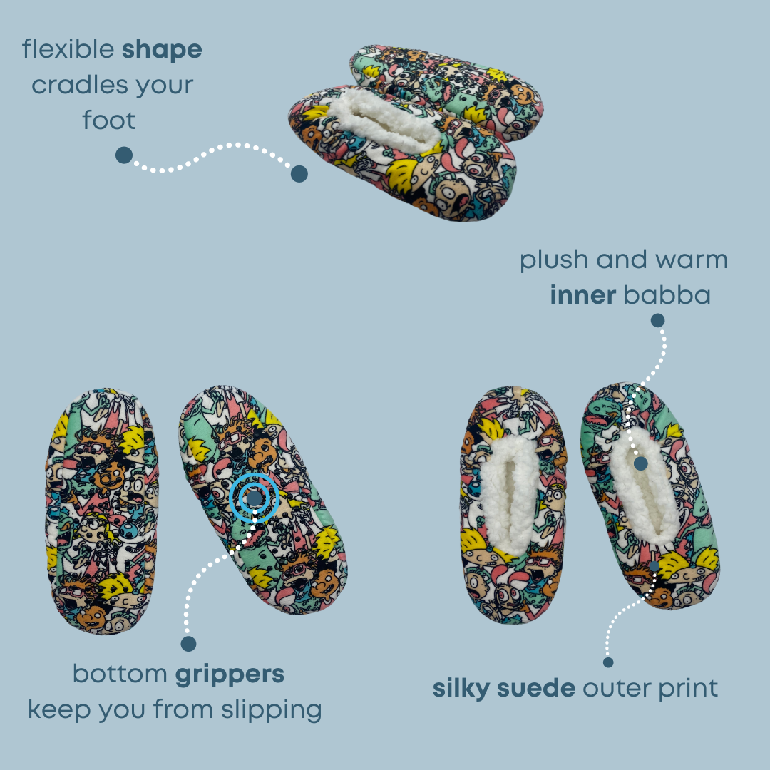 Cozy up in style with these Rugrats Printed slipper socks. Designed to keep your feet warm and trendy, these slippers boast a soft, fluffy Babba sherpa lining, and a marshmallow-like foam bottom. The SafetyDots™️ non-slip grippers keep you from sliding!